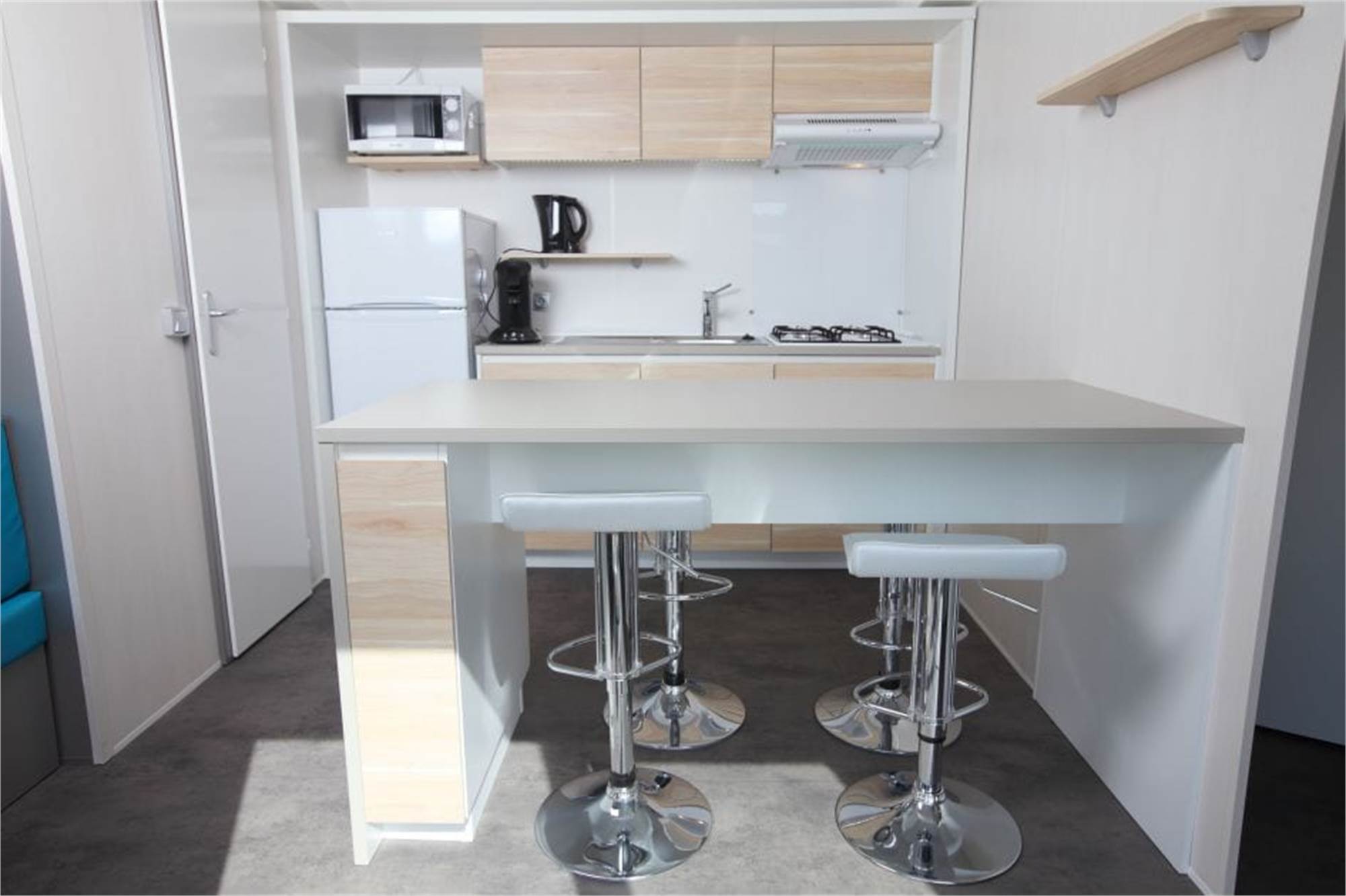 This is a small, but with practical and modern furnishings chalet, suitable for 4 persons. It has a seating corner with smart TV and the kitchen is equipped with a coffee pad machine and microwave, among others. The chalet has 2 bedrooms, with 2 single beds each. The bathroom is fitted with a shower and there is a separate toilet. There is also a furnished terrace. You can make free use of Wi-Fi.
