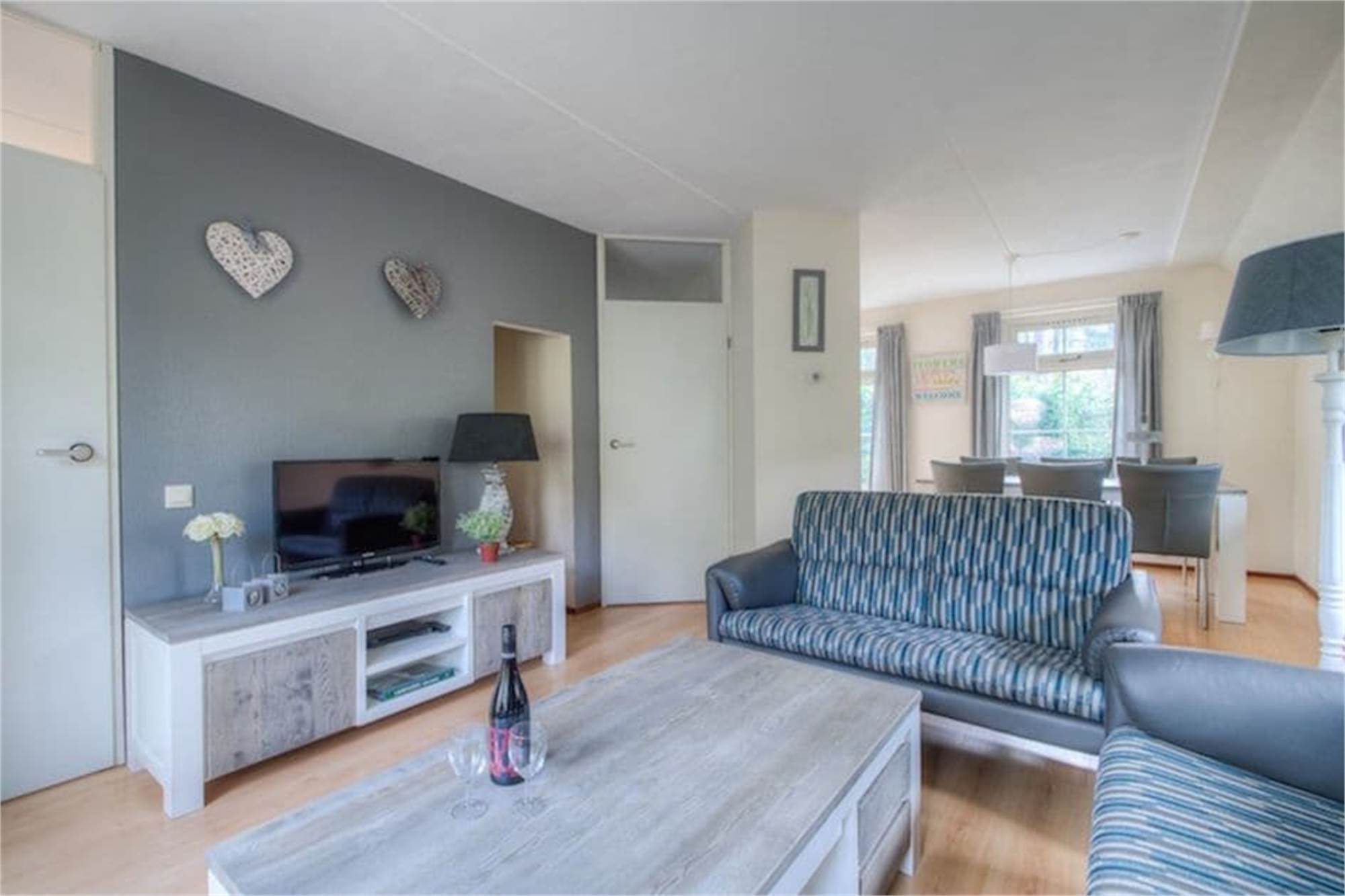 All accommodations are equipped with a flat screen television, microwave, dishwasher, CD player, free Wi-Fi, boxspring beds, stair gate on the first floor and terrace with garden furniture. Barbecuing is not permitted. There is parking space for one car at the country houses. Any remaining cars must be parked in the central car park.